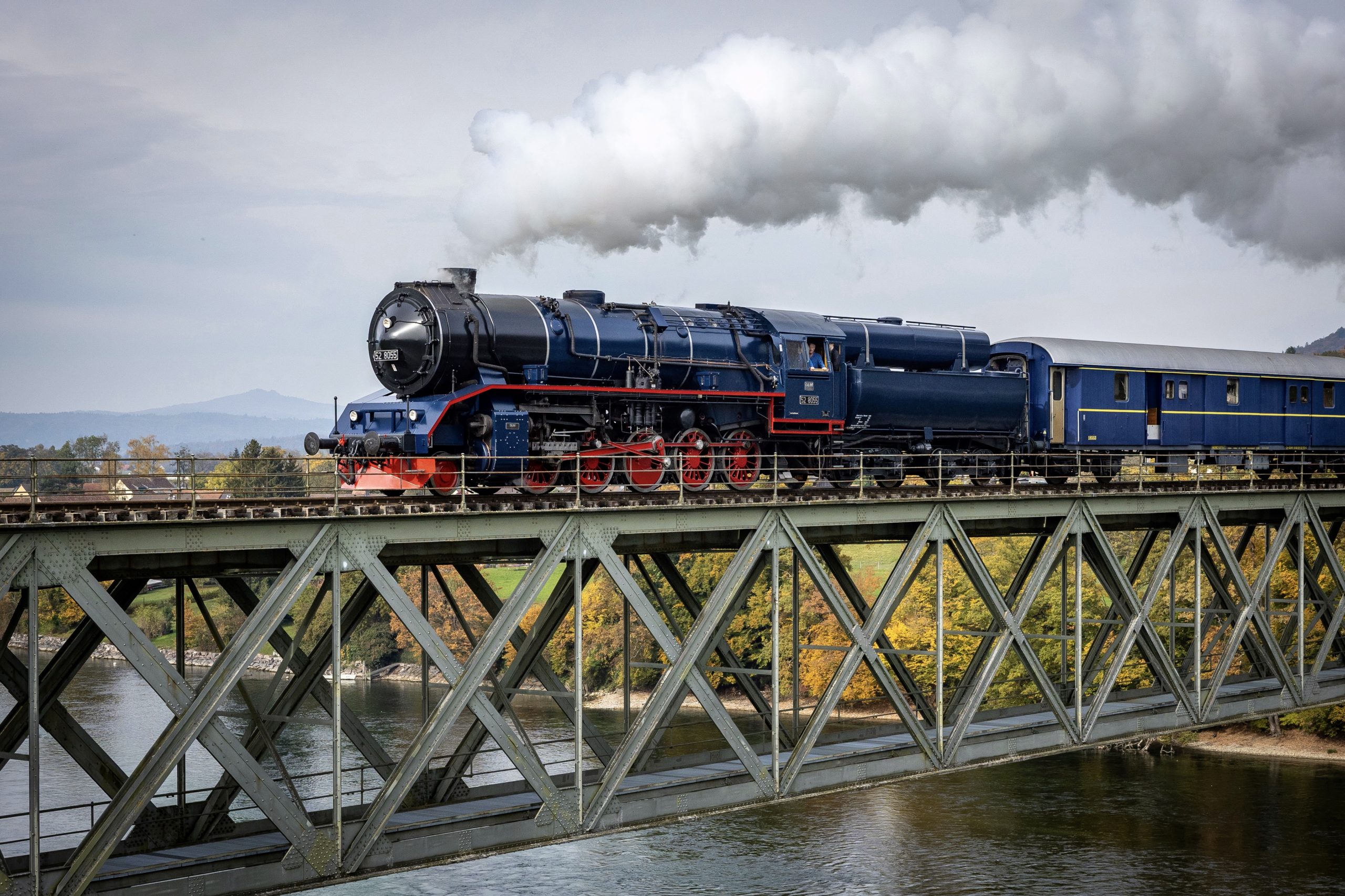 The overhaul of DLM's modern steam locomotive 52 8055 was actually completed by the end of May 2025, less the train-guard system. Its repair by external companies progressed real slow, so that another locomotive with a certified train-guard system was necessary for the return journey of 52 8055 to its home shed at Schaffhausen on 26 May 2025, see earlier news. Now, several months and several electrical companies later, the ETM-S train-guard system was tested and certified on Friday, October 17, 2025, so that additional engines are no longer required. On Sunday, October 19, 52 8055 speeded light engine from Schaffhausen to Etzwilen, from where three return trips into the German town of Singen were done. The three carriages were not a real challenge for the powerful 52 8055. A lot of steam was used to operate the 52 8055's South-African and Chinese chime whistles, as there are quite a few road crossings on this line. Most unusual is the crossing of a roundabout near Singen, surprising many a car driver.